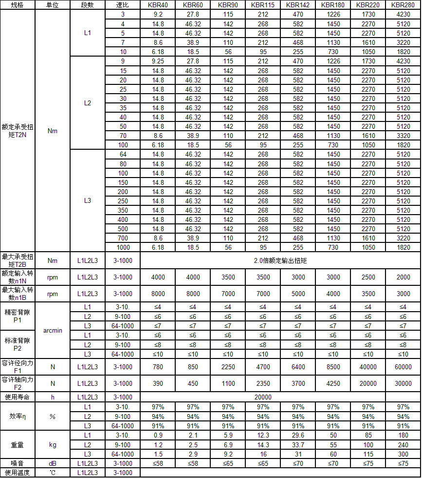 KBR系列精密伺服直角行星減速機性能參數(shù):