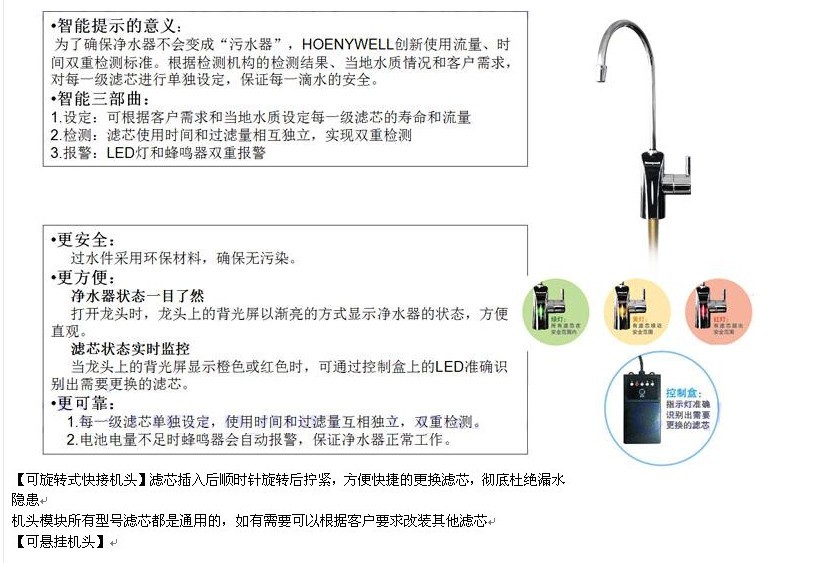 4、 細菌和有機物污染是飲用水最常見的問題,Honeywell特有的MS殺菌濾芯能有效殺滅 自來水中的細菌去除率可達100%,避免細菌群落在超濾膜表面形成生物膜,導致流量減少,出水有異味(細菌的代謝物)。重金屬污染也時有發生,比如最常見的鉛,而Honeywell特有的ACF出鉛濾芯能有效去除重金屬鉛即使在自來水標準上限15倍的情況下仍能有效去除。這些功能全部經由中國疾病預防控制中心環境與健康相關產品安全所檢測認證,并非廠方的自我宣傳。所以效果的話您可以完全放心。