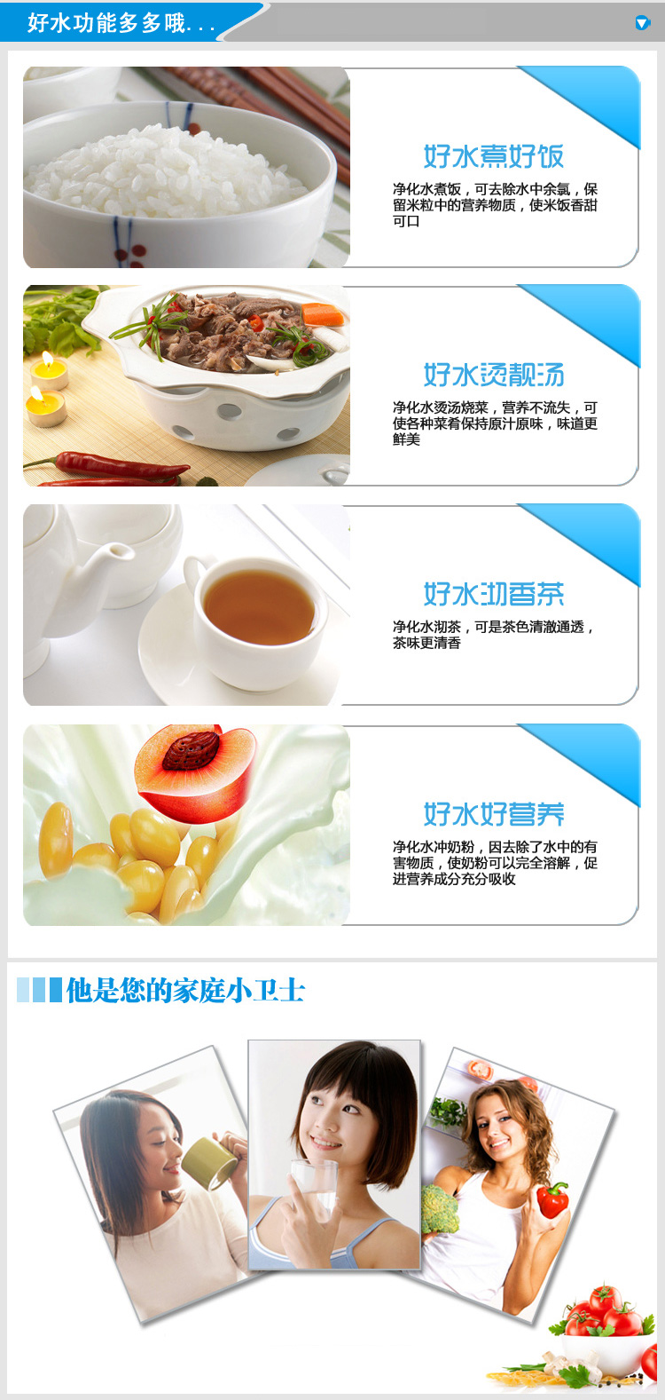 1、霍尼韋爾凈水器全部采用無桶式設計,隨時飲用新鮮的凈水。其他品牌都帶有儲水罐, 會產生二次污染,時間長了還會滋生細菌。