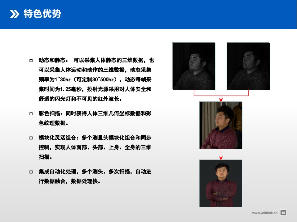 2 在物體表面投射光學(xué)散斑紋理或?qū)θ梭w安全和舒適的閃光燈和不可見紅外波長,可在在1.25毫秒(1/800秒)實現(xiàn)人體三維幾何和彩色紋理數(shù)據(jù)采集,有效避免人體晃動造成的誤差。
