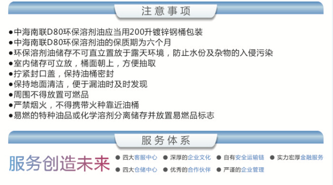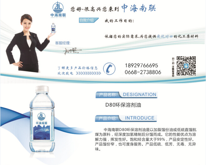 本公司供應茂名石化/金陵石化/荊門石化D80溶劑油,該產品鎦程為210-250,閃點80-85。該產品硫化程度深,無芳烴含量,無色無味。可用于拋光蠟稀釋劑,蠅香稀釋劑,涂料稀釋劑,油墨稀釋劑等用途。本公司在東莞市麻涌鎮新基工業區擁有大型倉儲,珠三角地區采用專車配送,價格優勢明顯。在上海亦有分公司,與南京金陵石化,山東齊魯石化等大型國企簽訂經銷合同,可槽車配送,歡迎來到咨詢中海南聯銷售經理李先生,秉承客戶就是上帝的銷售理念,24小時服務熱線——手機:189 2976 6695(微信同號)
