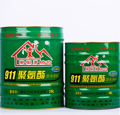 家實多911聚氨酯防水涂料屬高分子化學(xué)反應(yīng)型防水涂料。它是由含異氰酸酯基(-NCO)的聚氨酯預(yù)聚體(甲組份)和含有多羥基(-OH)固化體、以增塑劑、增粘劑、防霉劑、稀釋劑等助劑的混合物(乙組份)組成。雙組份按一定比例混合均勻,經(jīng)過固化后形成均勻的、富有彈性防水的整體防水膠膜。