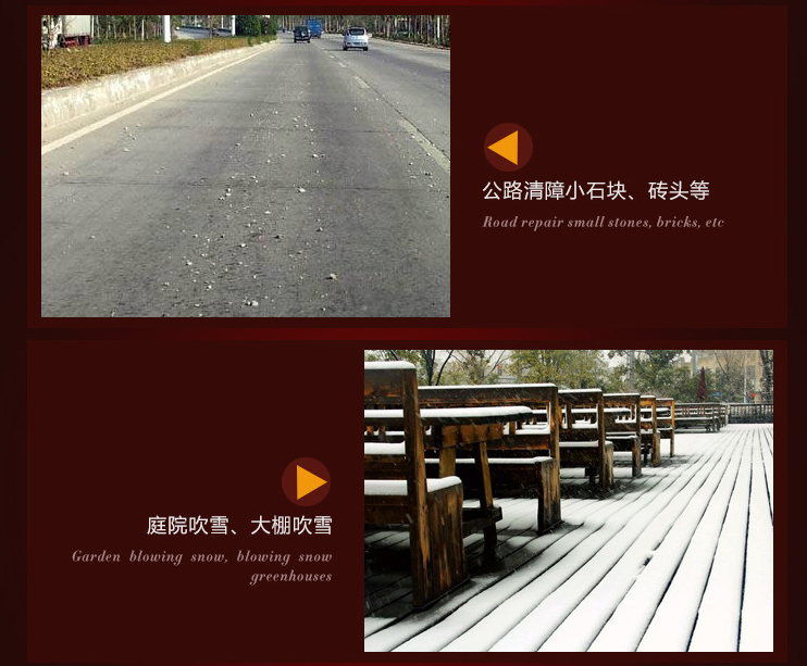 6.應用:園林養護中落葉和塵土,工程建筑上灰塵和沙石,市政道路的塵沙雜物,溫室大棚的冬季積雪,清理表面雜物的各類工作,讓你獲得事半功倍的功效