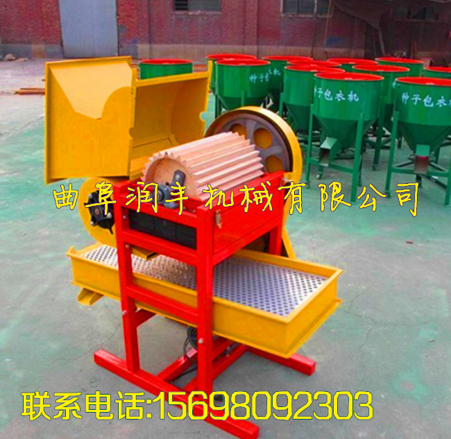 花生脫殼機有機架、風扇、轉子、單相電機、篩網(有大小兩種)、入料斗、震動篩、三角帶輪及其傳動三角帶等組成。