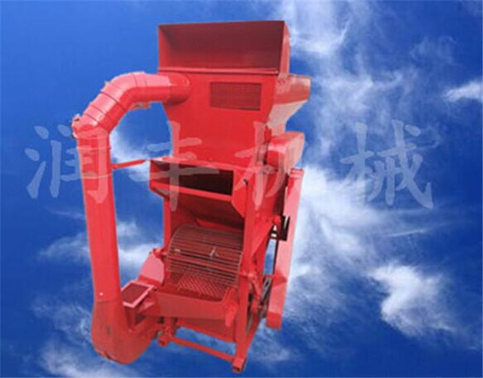 花生粒及破碎的花生殼在轉子的旋轉風壓及打擊下,通過一定孔徑的篩網(花生第一次脫粒用大孔篩網,清選后的小皮果更換成小孔篩網進行第二次脫殼),這時,花生殼、粒受到旋轉風扇的吹力作用,重量輕的花生殼被吹出機體外,花生粒通過震動篩的篩選達到清選的目的。