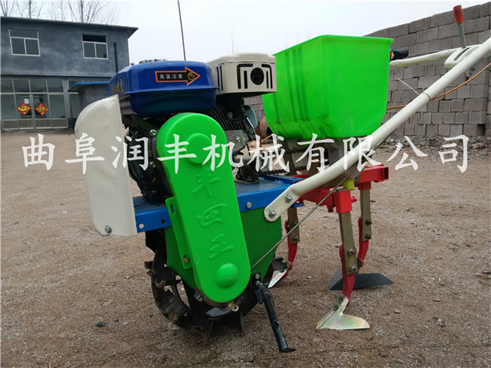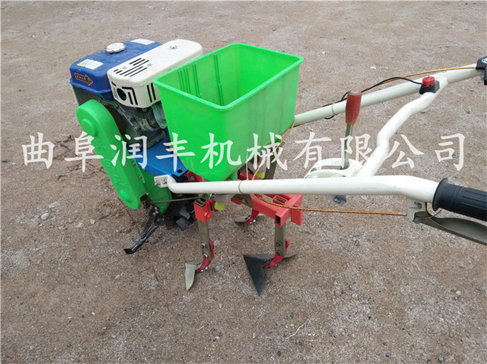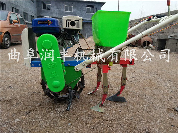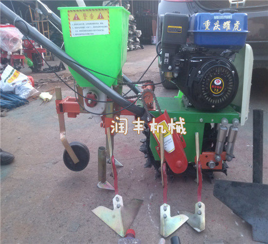 介紹:多功能汽油施肥播種器是旱田使用的小型機械。適用于所有旱田農作物壟間作業。是廣大農民朋友實現農業機械化的首選產品。 選配正規企業生產的變速箱,優質名牌汽油機為配套動力。易啟動,輕便耐用。整體板設計,一次成型,堅固耐用。加粗手把。人性化的優質手油門設計。新款增添了高低空檔掛擋離合功能獨特的主輪設計不溜溝,揚塵少,減少向變速箱漏土及纏草。主要功能:施肥;播種;松土;除草;開溝;扶壟;培土等發動機:四沖程 單缸 空氣冷卻施肥播種;行距和株距任意調制 耕寬:速度:3600kw/min 排量:216CC最大功率:7.5KW/3600rpm(7.5馬力)工作效率:約3-4畝/時 啟動方式:手拉啟動凈重:50KG 毛重:70KG外箱尺寸:110X74.5X90cm 1:手把能高低,長短調節,適用于每一個人。 2:耘鋤板經過高溫滲碳處理,不需再加工。 3:先進的耘鋤架設計,斜支板設有調整孔,用來調節耘鋤板的抬頭,低頭, 耘地的深淺。耘鋤腿的高低調節是手把高低的輔助調節,不起耘地深淺的調節作用。 4:化肥斗支架有前后3個螺絲固定,方便拆卸,不使用時可以卸掉,以防碰壞。獨創的分離設計,三角帶傳動,不存在頂鏈條的問題。播種施肥可雙行,單行,前后使用,耘地施肥可同時進行。調節手柄,施肥量5~50千克可調。更換樓心,可以直播各種農作物。 5:施肥播種,耙地時,設有壓土輪,不用抬著,省力方便。 6:簡單合理的支稱,在使用單行播種,施肥,單鏵耘地時,支稱下放,整機能夠水平放置。方便添加種子,化肥。實現一人操作。 7:培土器有左,右分土鏟。安裝在耘鋤架左,右滑塊上,實現雙行培土。滑塊左,右互換,能夠把分土鏟前角靠在一起,實現平地開溝。分土鏟左,右互換,實現平地扶壟。斜支板的調整孔來調節分土鏟深淺及分土,培土多少。點播原種,直播毛仔,一次成功,每小時1~1.5畝,設計合理不存在缺陷。更換樓心,可以精播棉花,玉米,花生,大豆,向日葵。調整手柄播種量大,小隨意可調。 免除了中間商,生產者直接與用戶見面,簡化了流通過程,縮短了流通時間實現了真正的廠家優惠價格。