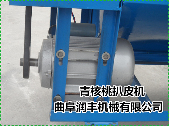 新型青核桃脫皮清洗機主要包括機架部分,喂給部分:上下防護罩板,傳動罩安全機構;單相電動機、三角皮帶傳動、變速箱等動力、水泵部分;旋切滾筒、調節格柵、鋼絲毛刷等脫皮部分。
