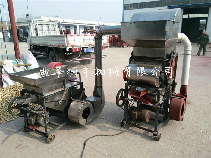 山東曲阜潤豐機械廠新研制的花生脫殼機械,雙風機,帶震動篩,脫殼率98%。碎米率5%以內,分檢清楚,殼米分離良好,震動篩可以把大小米區分,產量大,耗電少,是加工花生的理想機械。
