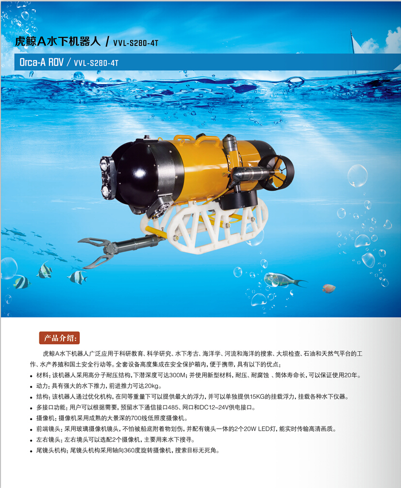 虎鯨A水下機器人廣泛應用于科研教育、科學研究、水下考古、海洋學、河流和海洋的搜索、大壩檢查、石油和天然氣平臺的工
