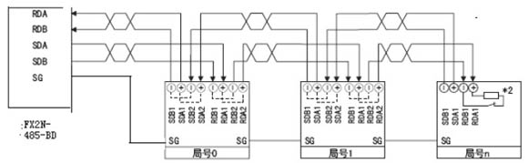 FX2N-485-BD與n臺變頻器的連接圖