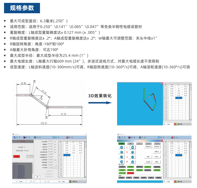 式避免了傳統加工時易造成電纜拉伸和起皺的品質問題,也克服了人工成型效率低、精度差、難度大、成品率低等缺陷,***提高了成型加工的生產效率與產品品質。