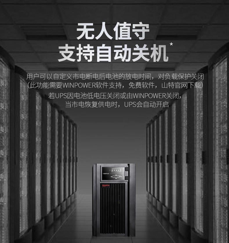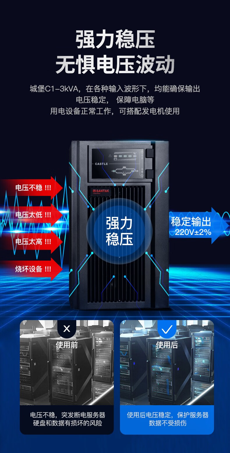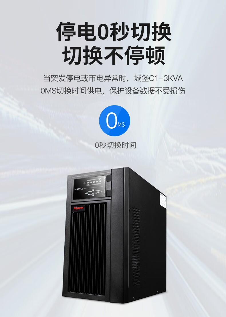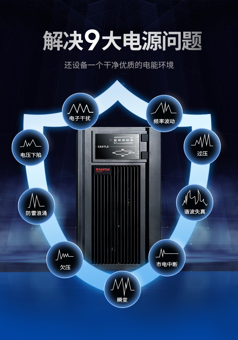 城堡C1-3K 山特城堡C1-3kVA是目前中國市場存量廣,暢銷的在線式C1-3kVA UPS。通過30年的經驗積累,先進的數字化控制技術,在解決9種電力SANTAK山特C2Kups不間斷電源在線式穩壓 2000VA/1600W服務器機房電腦問題(市電斷電、電壓下陷、浪涌、欠壓、過壓、電子干擾、頻率波動、瞬變、諧波失真、其他)的基礎上,進一步提高了產品的適應性和可靠性,為用戶設備以及UPS 本身提供萬無一失的保障。 C1-3kVA主要應用場景描述: *IT 及網絡設備 小型服務器及工作站、交換機和監控設備 * 嵌入式及自動化控制系統 ATM柜員機、自動售票機、電力及鐵路信號系統、SCADA監控系統 * 辦公及商務設備 辦公電腦、打印機、掃描儀,機等設備