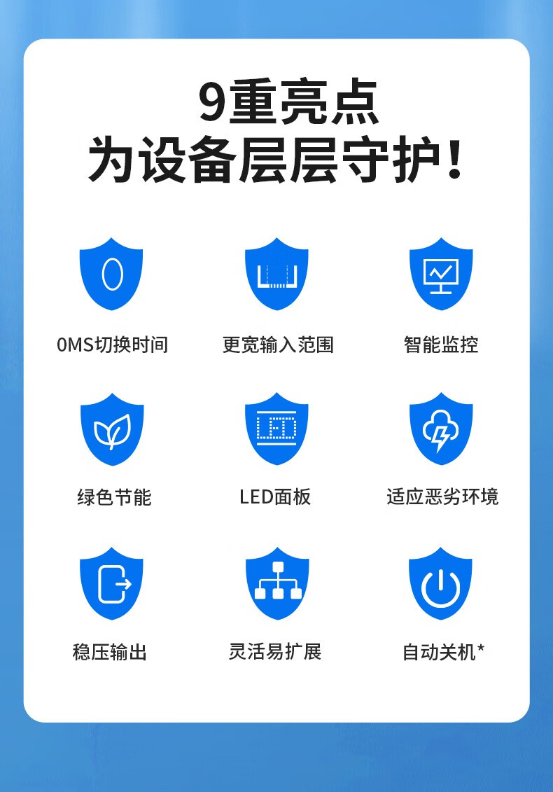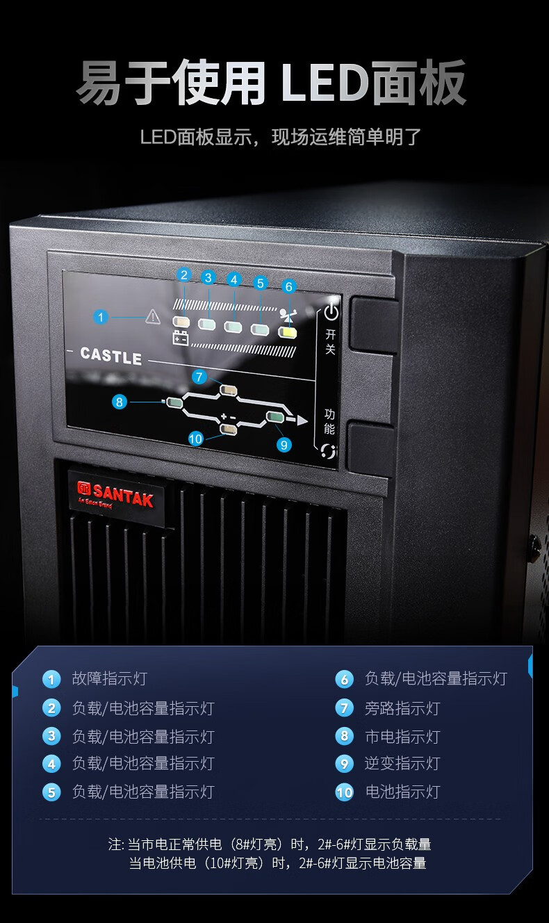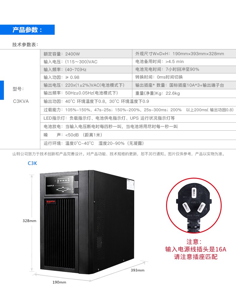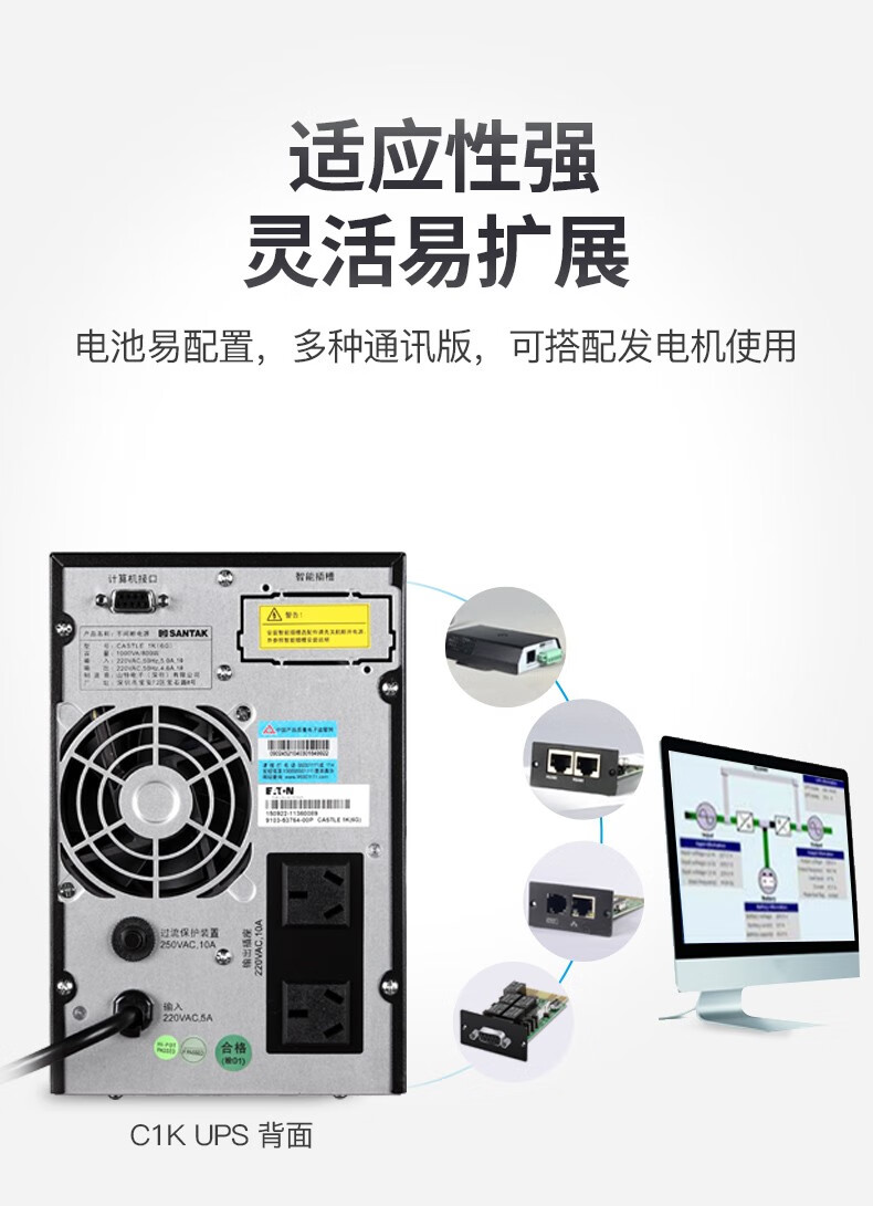 城堡C1-3K 山特城堡C1-3kVA是目前中國市場存量廣,暢銷的在線式C1-3kVA UPS。通過30年的經驗積累,先進的數字化控制技術,在解決9種電力SANTAK山特C2Kups不間斷電源在線式穩壓 2000VA/1600W服務器機房電腦問題(市電斷電、電壓下陷、浪涌、欠壓、過壓、電子干擾、頻率波動、瞬變、諧波失真、其他)的基礎上,進一步提高了產品的適應性和可靠性,為用戶設備以及UPS 本身提供萬無一失的保障。 C1-3kVA主要應用場景描述: *IT 及網絡設備 小型服務器及工作站、交換機和監控設備 * 嵌入式及自動化控制系統 ATM柜員機、自動售票機、電力及鐵路信號系統、SCADA監控系統 * 辦公及商務設備 辦公電腦、打印機、掃描儀,機等設備