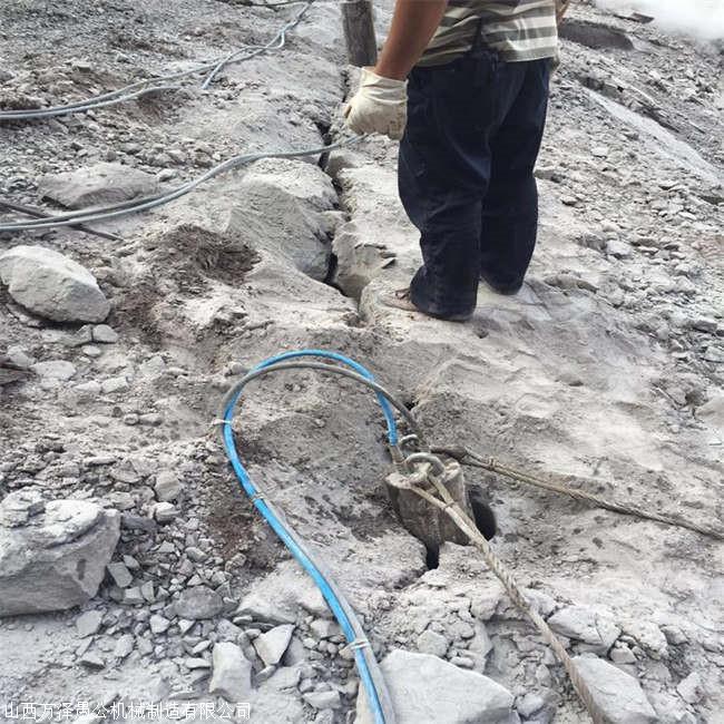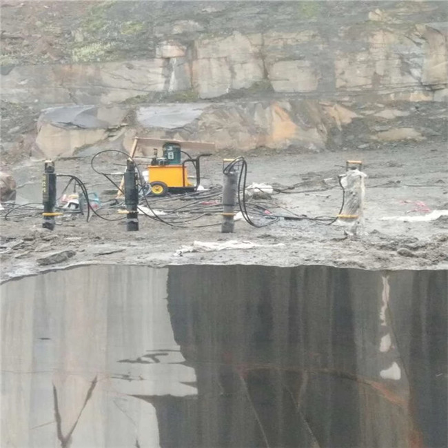 機在堅硬巖石 (花崗巖等)上鉆對應孔,在鉆好的圓孔上,插入分裂槍。啟動液壓泵站,液壓泵站工作產生高壓,驅動分裂槍的中間楔塊向下延伸,將反向楔塊往兩邊撐開,其瞬間產生的巨大分裂力 (達800T),直接破壞巖石內部結構,從而達到巖石分裂的作用。(巖石在此分裂力作用下,沿設定的位置可根據人們的需要分裂開來。)首先,在被分裂的物體上鉆一個特定直徑用11-11.5公分和1.7m深度的孔,孔與孔的距離2.5米左右,將分裂機的楔塊組(一個中間楔塊和兩個反向楔塊)插入孔中,中間楔塊通過液壓壓力的作用在兩個反向楔塊之間向前運動,由內向外釋放出的能量—5000噸,將被分裂的物體在40-50秒鐘之內按預定方向裂開。