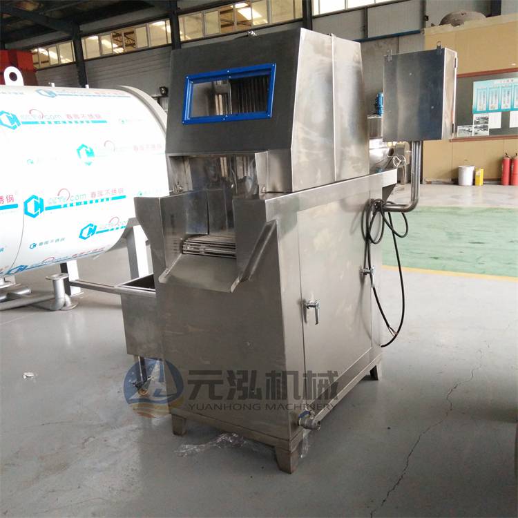 可以將輔料調配好的腌制液通過針頭注射到肉里面去,在通過后面的一臺滾揉機是料液充分腌漬滲透,可以疏松肌肉結構組織,有肌球蛋白溶出,配置的調味料可以使肉的質量更加的嫩化、松軟,從而可以提高肉制品的出品率,改善肉的口感和嫩度。