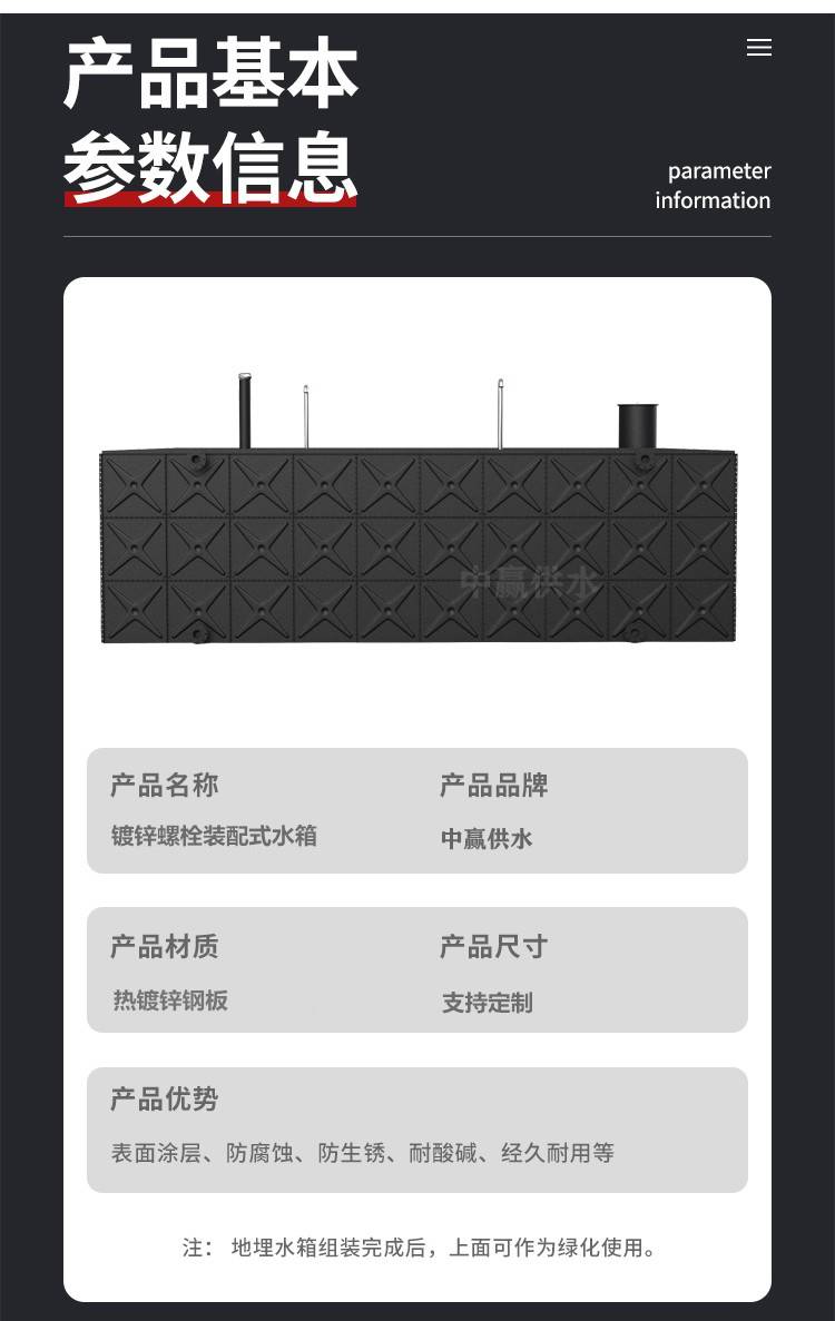 水箱板塊外形尺寸為:1米寬、1-4米長,外形尺寸可以精確到±2mm,單位一米長的側面只需要一塊側板,通過吊裝器具定位裝上橡膠止水壓條,擰緊定位螺栓即可,非常簡便,無需專業技能,該水箱可任意拆裝組合重復利用。